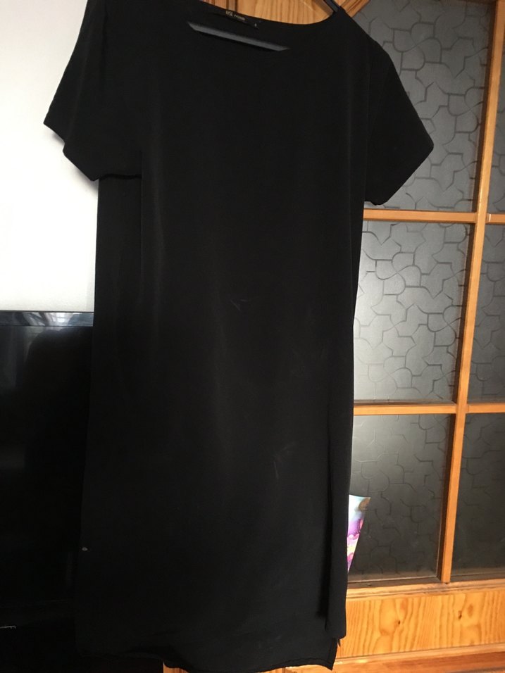 Siyah, kısa kollu, yuvarlak yakalı, rahat kesim tunik. Ofis kullanımı için uygun, ipeksi dokulu ve sade tasarımlı.