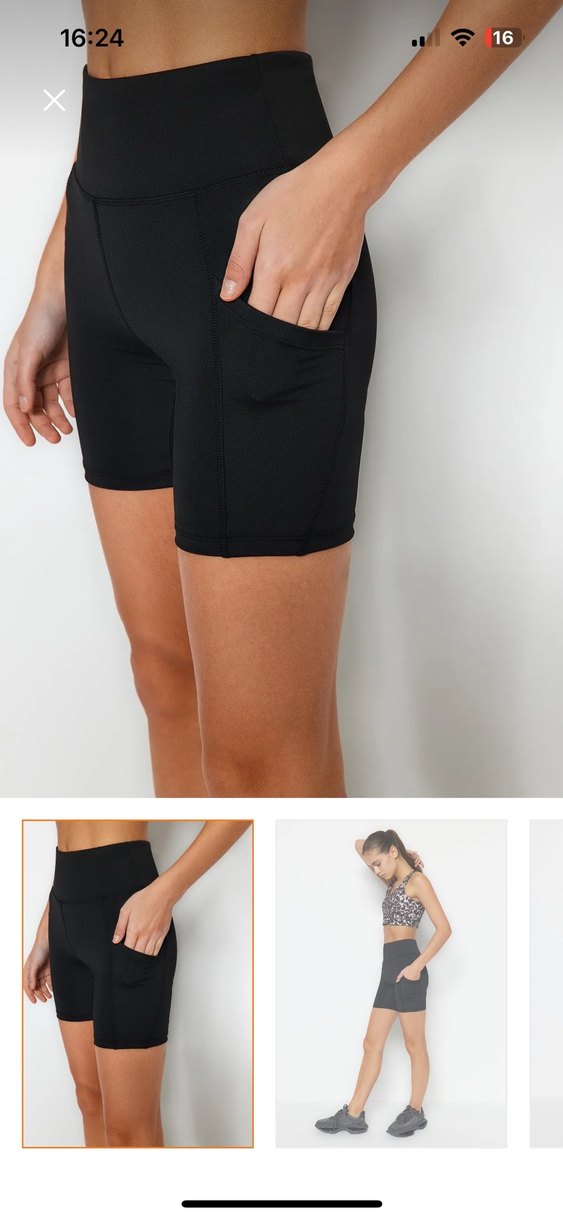 Yumuşak sentetik kumaştan yapılmış, yan cepli siyah slim hamile şortu, spor ve streetwear tarzına uygundur.