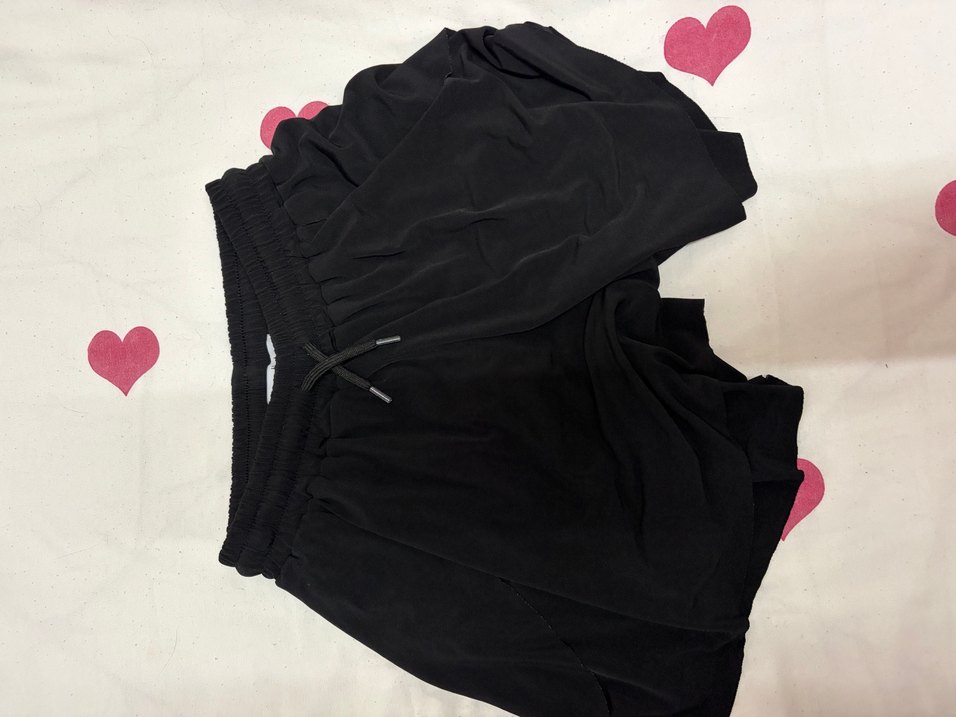 Siyah, elastik bel bantlı, yumuşak sentetik kumaştan rahat kesim midi şortu, dış mekan kullanımı için uygundur. İçinde kısa tayt vardır