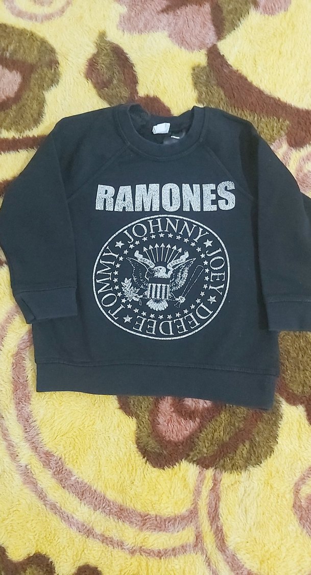 Yumuşak ve sıcak kumaştan, siyah renkli, uzun kollu, yuvarlak yaka, Ramones baskılı ve payetli, bol kesim erkek sweatshirt.