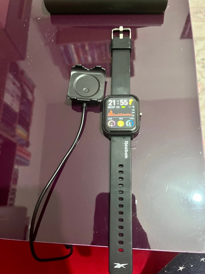 Siyah Reebok akıllı saat, 21:55 saat göstergesi ve şarj istasyonu ile birlikte gelir. Ayarlanabilir kayışı vardır. ⌚ çok az kullanıldı
