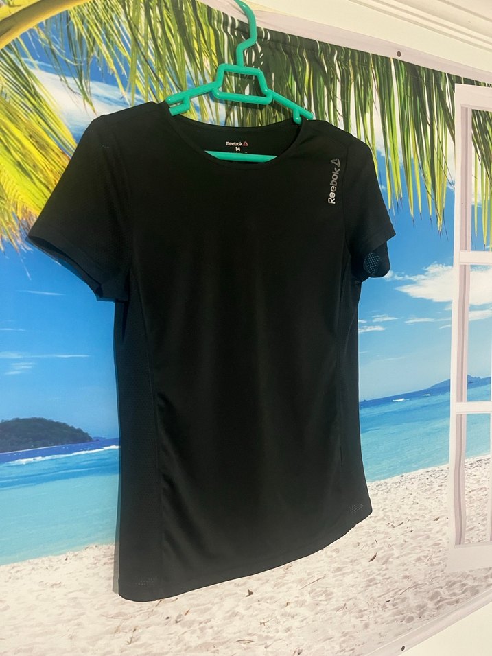 Kısa kollu, bisiklet yaka siyah Reebok tişört, rahat sentetik kumaştan, spor ve şehir stili için hafif baskılı logo ile.