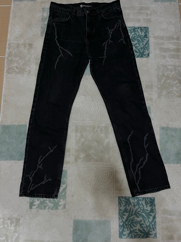 Bağlama desenli siyah regular fit kot pantolon, yırtmaç detaylarıyla sokak stilini yansıtır, günlük kullanım için uygundur.