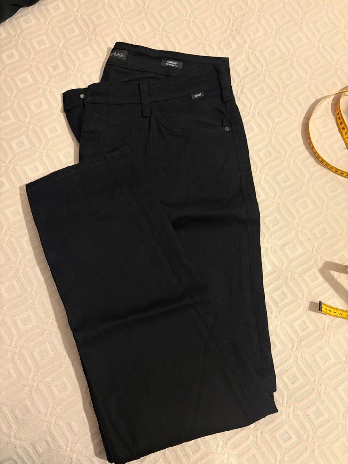 Siyah regular fit denim pantolon, tokalı detaylı, günlük rahat ve sokak stili için uygun.