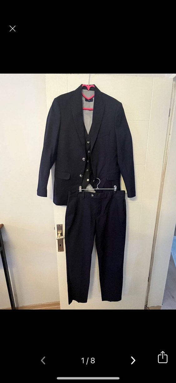 Siyah, regular fit, kruvaze yaka ve kemerli erkek takım elbisesi. UKI marka paçası açılıp kendi boyunuza göre ayarlanabilir kolayca