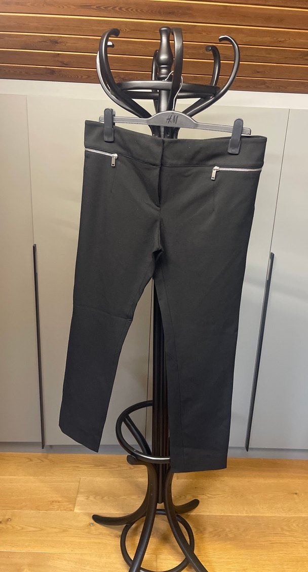 Siyah regular fit kumaş kadın pantolon, fermuarlı cepler ve midi boy ile. Ofis ve sokak stili için uygun, sentetik kumaştan üretilmiş trendy rahat görünüm.