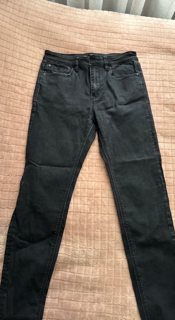Siyah denim kot pantolon, regular fit ve midi boyda skinny jean.