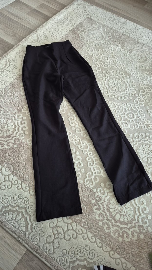 Siyah, regular fit, midi boy, yırtmaçlı, sentetik kumaştan ofis için uygun klasik gotik tarz pantolon. yandan fermuarlı
