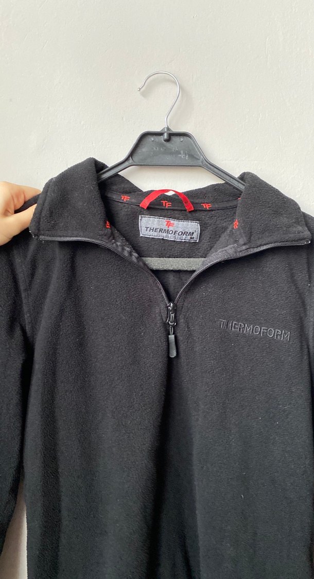 Fermuarlı ve bisiklet yaka gri erkek fleece sweatshirt. Düz ve normal boyda, outdoor için uygun. 'THERMOFORM' etiketi dikkat çekiyor.