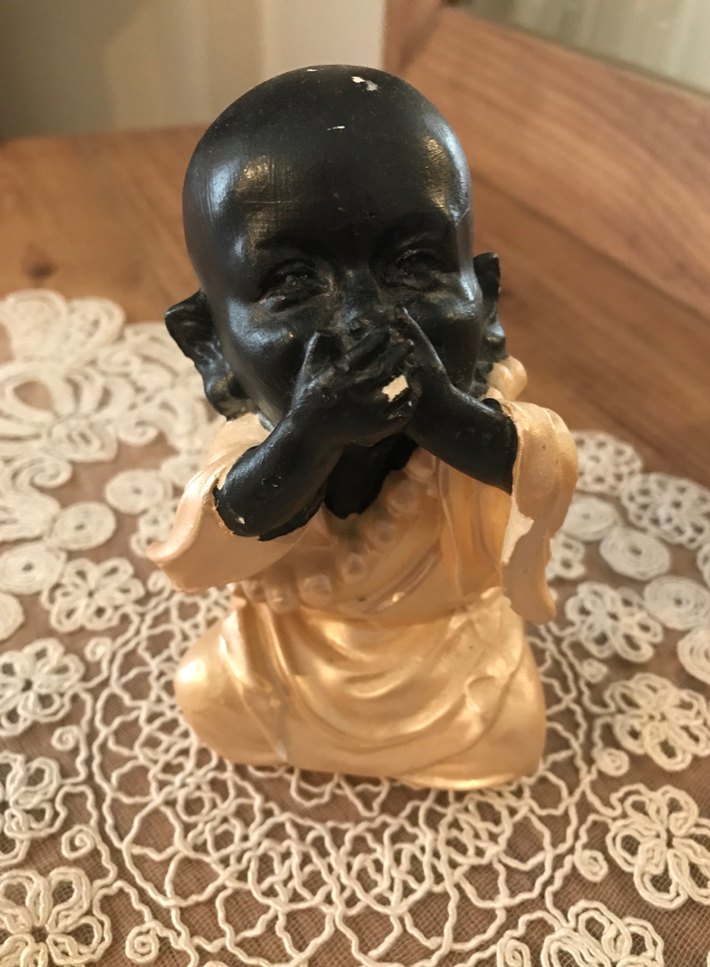 Açık renkli giysi giymiş, elleriyle ağzını kapatan siyah renkli figürin. Dantel masa örtüsü üzerinde yer alıyor.