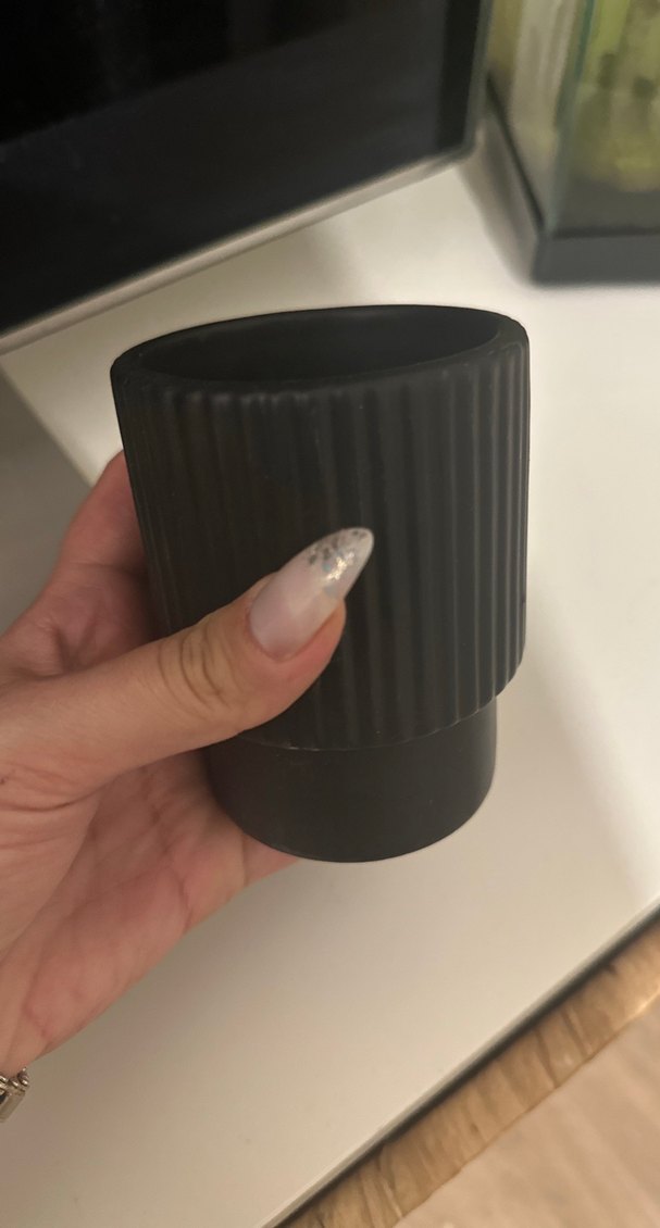 Siyah renkli, kabartmalı dokusu ve mat yüzeyiyle modern ve sade bir vazo. Küçük çiçekler veya dekor için uygundur.