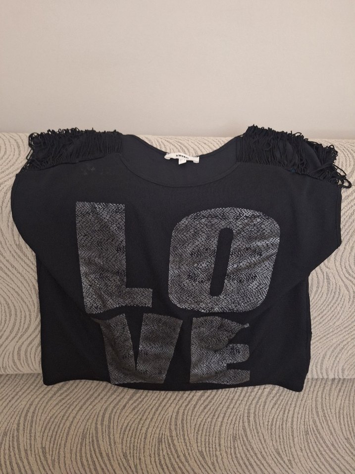 Siyah renkli, kısa kollu ve bol kesim kadın tişörtü. Gri renkte 'LOVE' baskısı ve omuzlarda fırfır detaylarıyla sokak stilini yansıtır. Günlük kullanıma uygundur.