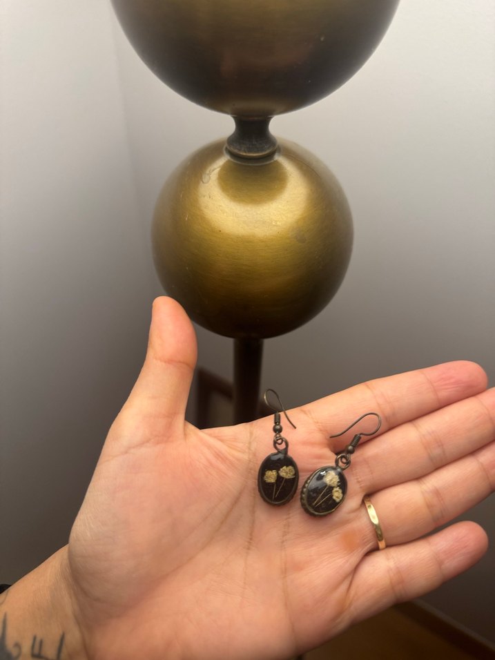 Siyah renkli, gerçek kurutulmuş çiçek detaylı minimalist gotik tarzda küpeler, romantik buluşmalar için uygun.