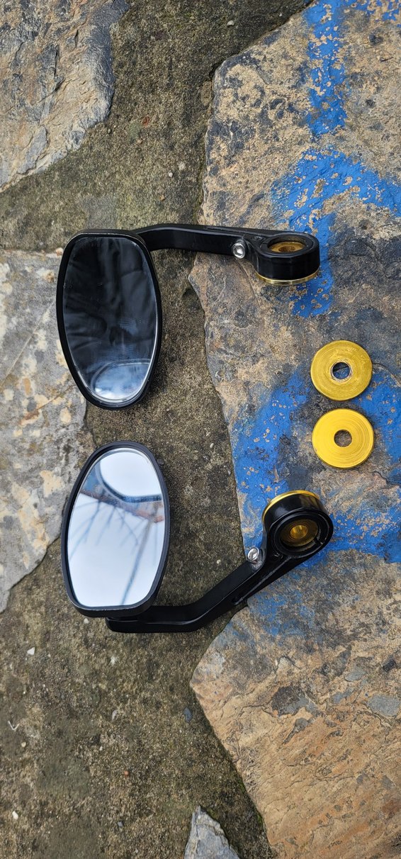 Renkli altın montaj parçalarına sahip siyah motosiklet yan aynaları, görünürlüğü ve şıklığı artırır. Ürünler temiz ve sorunsuzdur. Montaj vidası mevcut değildir. Sadece görselde görüldüğü gibi verilecektir. Ürünün iadesi yoktur. PTT kargo ile gönderilir.