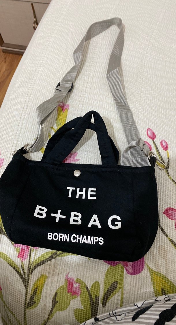 Siyah renkli üzerinde beyaz yazıları olan çanta