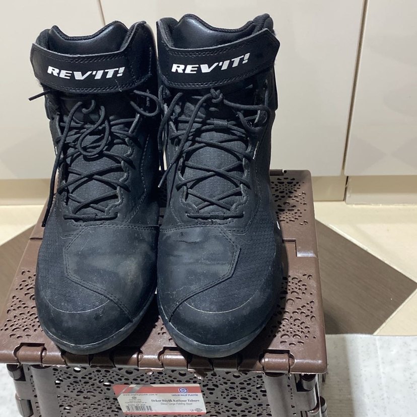 Siyah renkli REV'IT! markalı, kauçuk malzemeden üretilmiş biker tarzı erkek botları Velcro ile kapanır, günlük kullanıma uygundur. Ürün bir ay kullanıldı temizdir