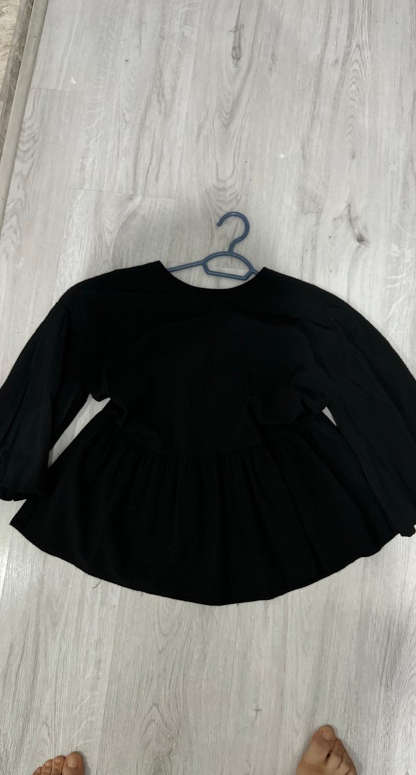 Siyah, yarım kollu , yuvarlak yakalı ve volan detaylı, midi boy ve bol kesim kadın bluz. Gotik stil için uygun.