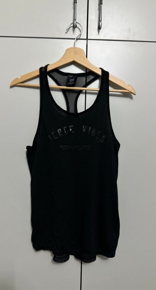 Siyah, yüksek yakalı, baskılı ve cırt cırt detaylı, sentetik kumaştan yapılmış, salaş kesim rock punk tarzı atlet. Spor ve sokak modası için uygundur.