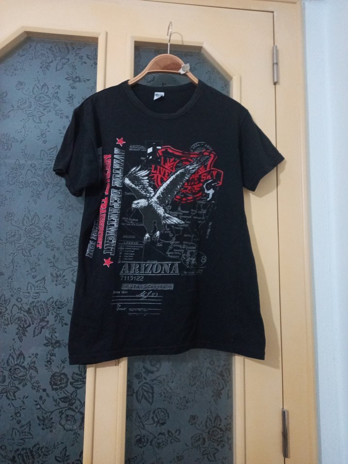 Siyah renkli, gevşek kesim erkek tişörtü, kısa kollu ve baskılı rock punk desenlidir. Yuvarlak yaka ve sentetik kumaştan üretilmiştir, günlük kullanım ve sokak stili için uygundur. iki koltuk arası 51 cm boyu 62 cm.Yakasında çok hafif renk açılması var son resimde gösterildi.Penye