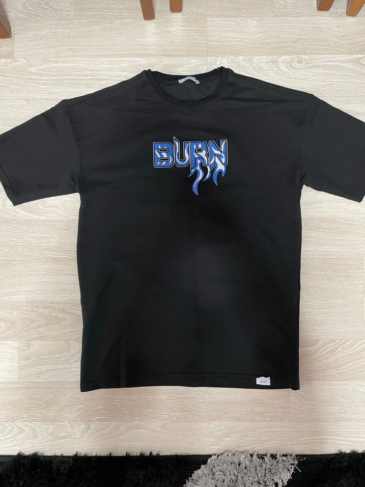 Arma Life - Kısa kollu, oversize kesim siyah tişört. Önünde mavi 'BURN' baskısı bulunur, rahat ve sokak stiline uygun.