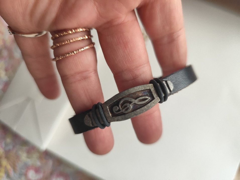 Siyah deri bant üzerinde müzik notası detaylı metal plaka bulunan erkek bileklik, rock punk tarzını yansıtıyor. Grunge punk alt kültürüne uygun koyu ve cesur tasarım.
