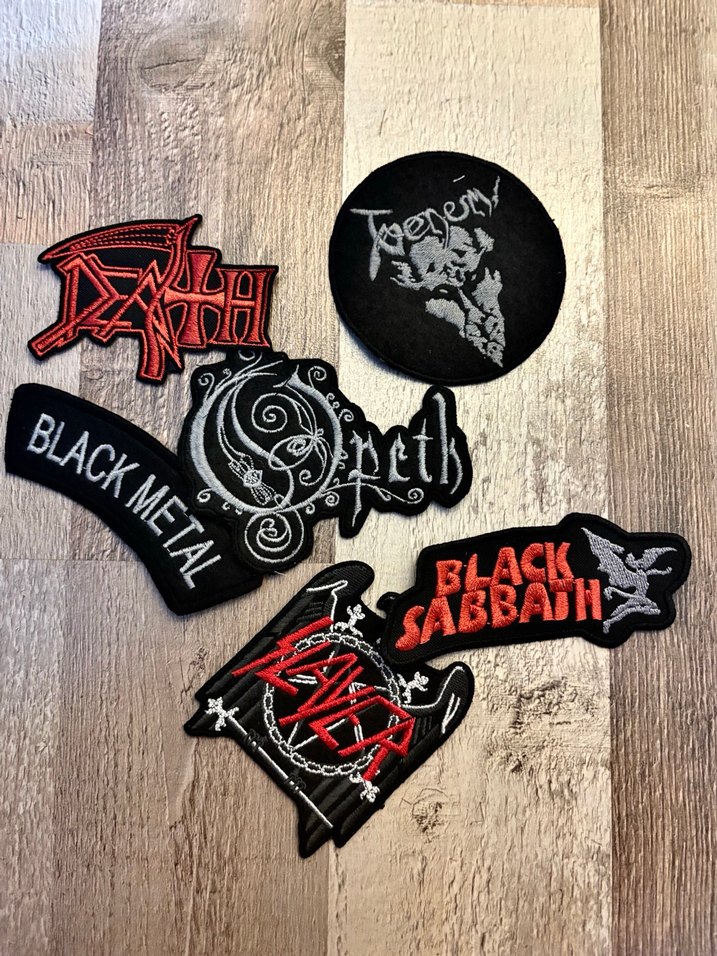 Siyah renkte, metal gruplarının logolarını taşıyan nakış detaylı rock punk rozet seti. Grunge punk tarzına uygun.