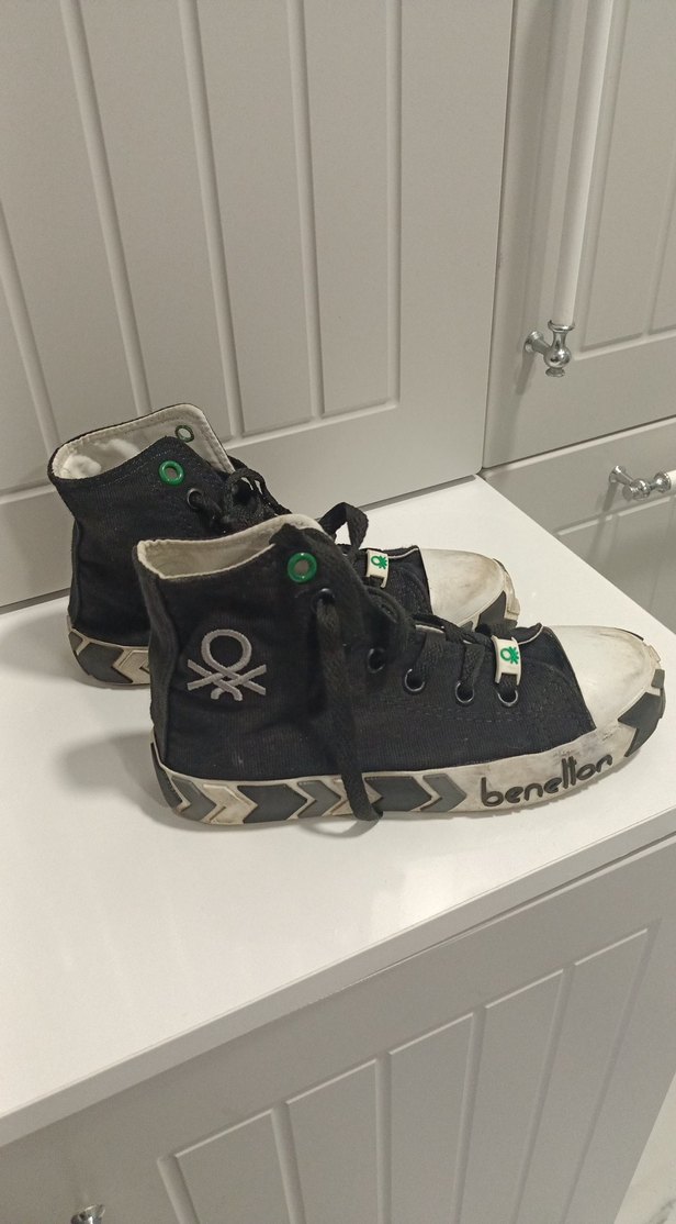 Siyah rock punk tarzı, platform topuklu, tokalı ve baskılı desenli sneakers. Kauçuk tabanlı, grunge punk havası yansıtıyor.
