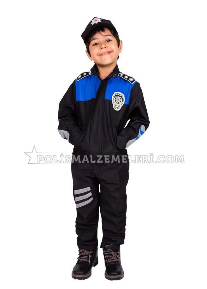 Siyah, fitted kesim, uzun kollu ve boğazlı çocuk sokak stili takım elbise. Baskılı detaylar ve cırt cırtlı kapanışlar bulunur.