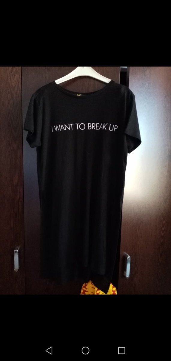 Siyah, pamuklu, kısa kollu, yuvarlak yakalı, bol kesim tişört Üzerinde "WANT TO BREAK UP" baskısı bulunur. Günlük kullanıma uygun, rock punk tarzında.