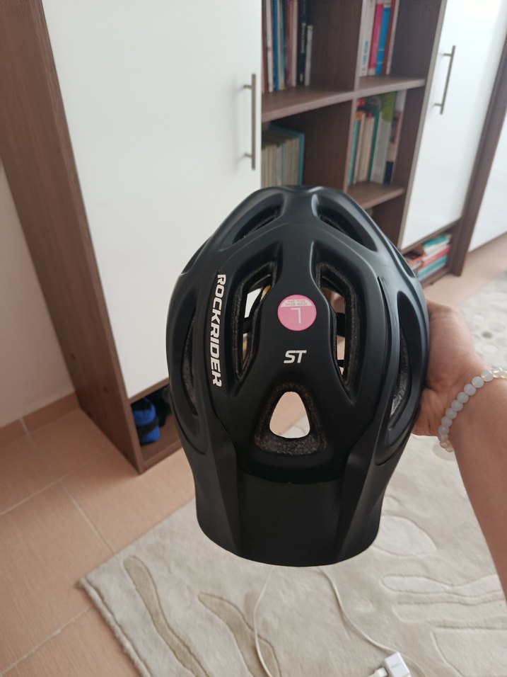 Dayanıklı plastikten yapılmış, siyah renkli Rockrider biker kask, velcro bantlı ve baskılı desenli. Hiç kullanılmadı.