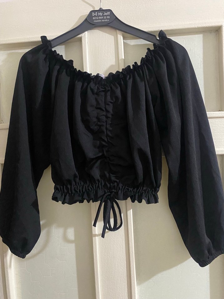 Siyah keten kumaştan, volanlı yakalı, uzun kollu, bol kesim kısa uzunlukta bluz. Bel kısmı büzgülü
