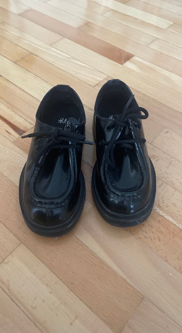 Siyah rugan görünümlü, bağcıklı ve toka detaylı erkek çocuk özel ayakkabısı. Koyu renk ve desensiz bir tasarıma sahiptir.