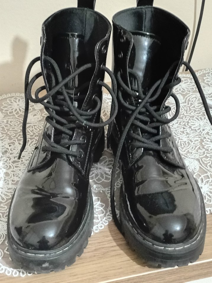 Parlak siyah rugan malzemeden yapılmış, bağcıklı ve ince topuklu gotik tarzda kadın botları, günlük kullanıma uygun sağlam tabanlıdır.