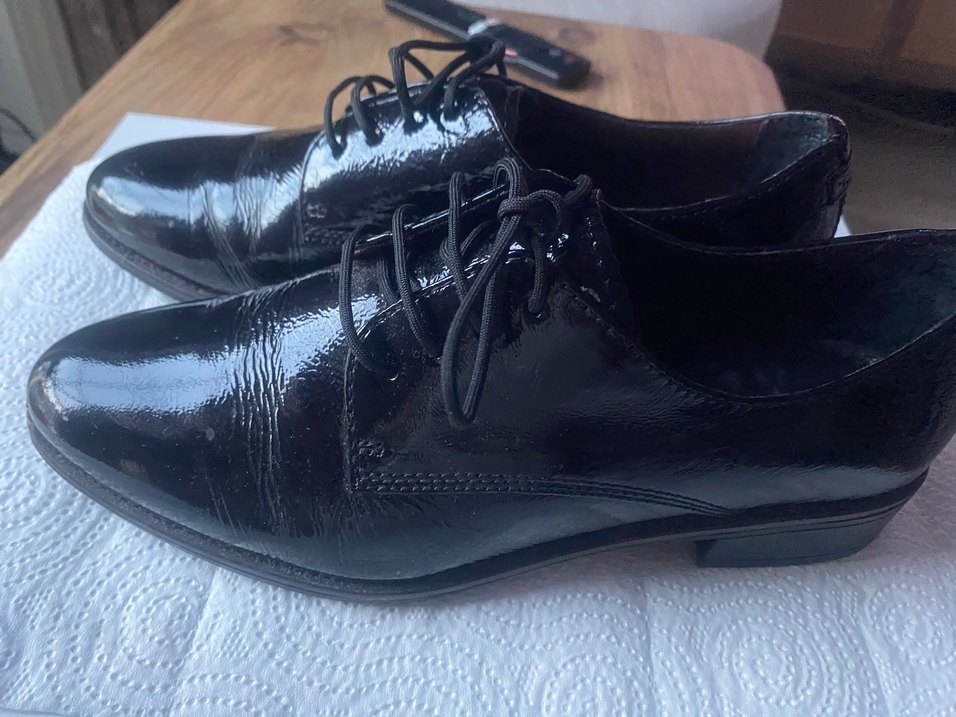Siyah parlak rugan görünümlü, bağcıklı,(2-3cm) topuklu kadın deri klasik ayakkabı. Ofis için Paris tarzı gotik şıklık sunar. (1-2 defa giyildi) Ürünler ertesi gün kargolanmaktadır) Ürün görsellerindeki 2. fotoğraflar tarafımdan çekilmektedir. Pazarlık payı yok maalesef Anlayışınız için teşekkür ederim