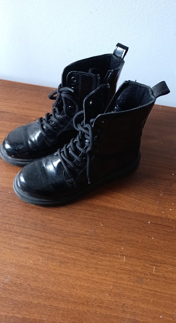 Siyah rugan, bağcıklı ve tokalı kadın botları. İnce topuklu, goth ve grunge punk tarzında, günlük kullanıma uygun.