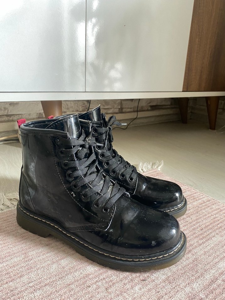Siyah rugan malzemeden, bağcıklı ve ince topuklu kadın botu. Düz desensiz, gotik punk tarzını yansıtan koyu renkte şık bir model.