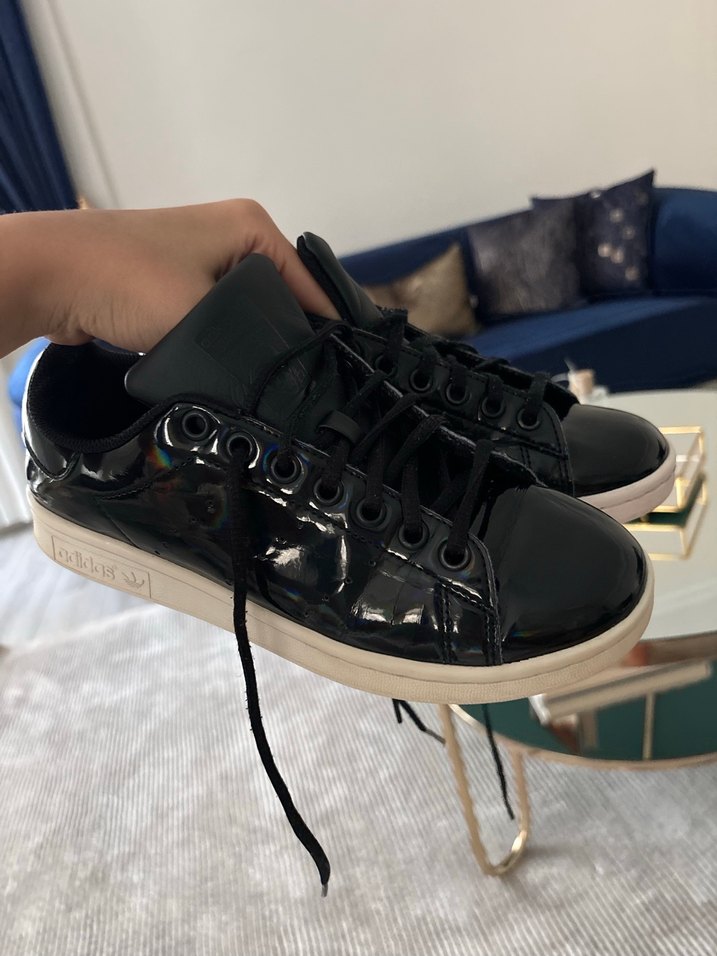 Bağcıklı, rugan siyah kadın spor ayakkabısı, ince topuklu ve kauçuk tabanlıdır. Günlük kullanıma uygun şık bir modeldir.