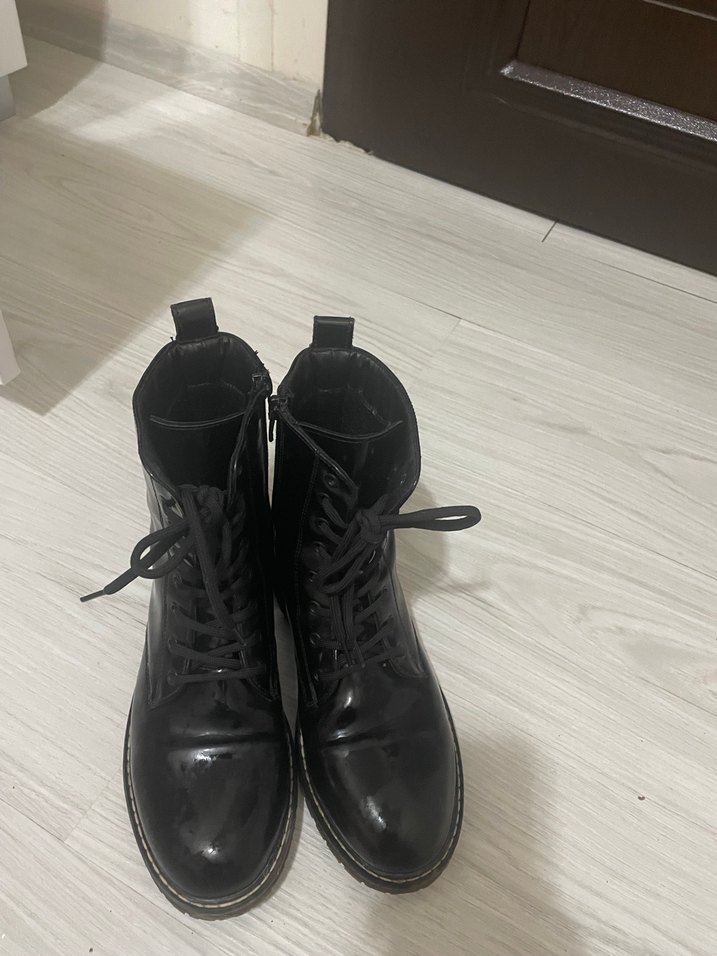 Siyah rugan malzemeden yapılmış, bağcıklı ve tokalı, ince topuklu botlar. Parlak yüzeyi ve punk tarzı detayları dikkat çekiyor ben 37 giyiyorum botlar 38 numara kalıbı bir tık küçük