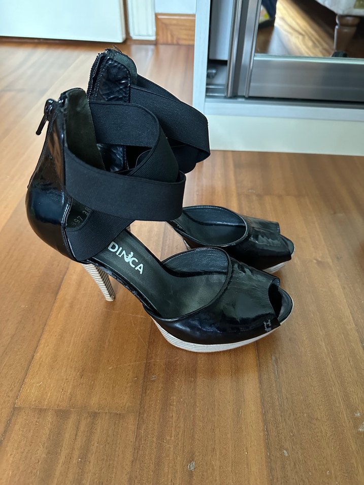 Siyah Rugan Bantlı Yüksek Topuklu Kadın Ayakkabı