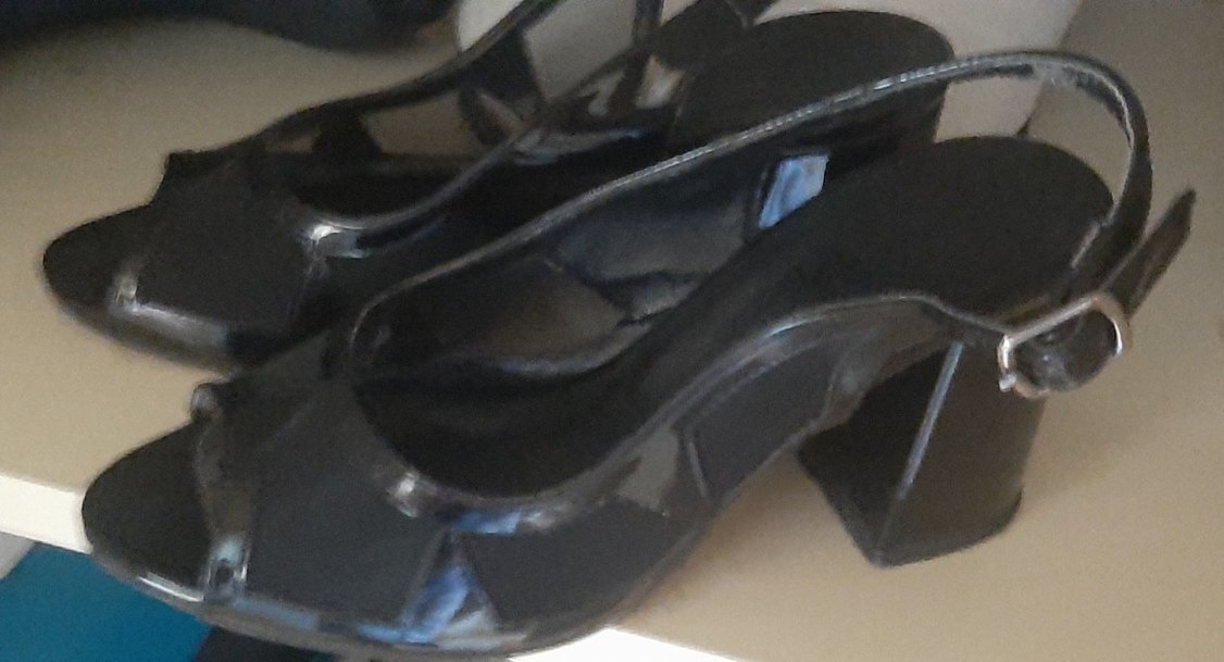 rugan siyah platform topuklu, tokalı kadın ayakkabısı. Kauçuk malzemeden, gotik ve avangart tarz partiler için uygun.