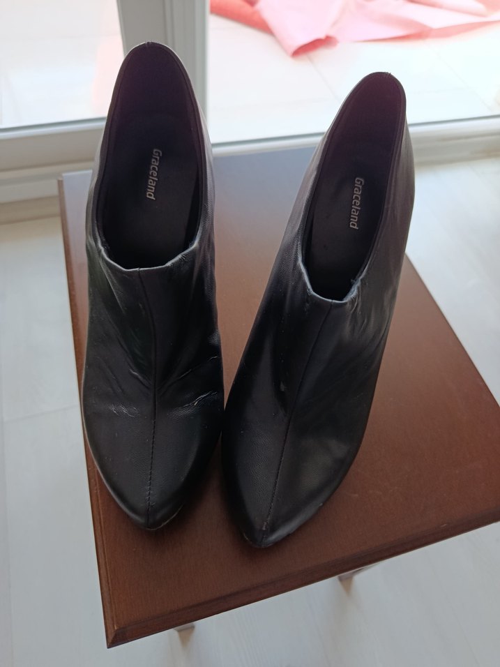 Siyah rugan dolgu topuklu stiletto, lastikli ve tokalı detaylı, minimalist goth tarzıyla ofis için uygun.