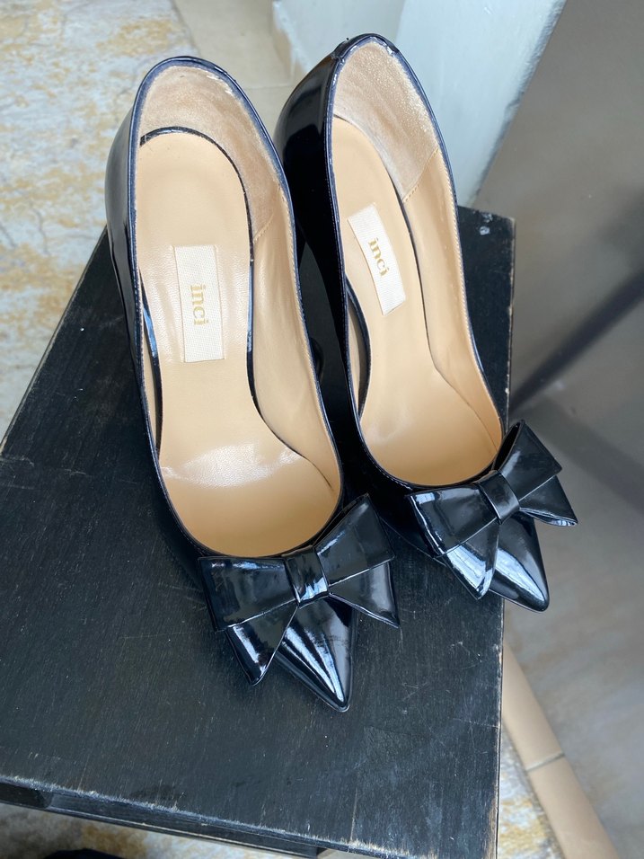 Siyah, rugan görünümlü lastik malzemeden yapılmış, fiyonklu yüksek topuklu sivri burun stiletto. Cesur, gotik tarzda romantik gece için uygun.