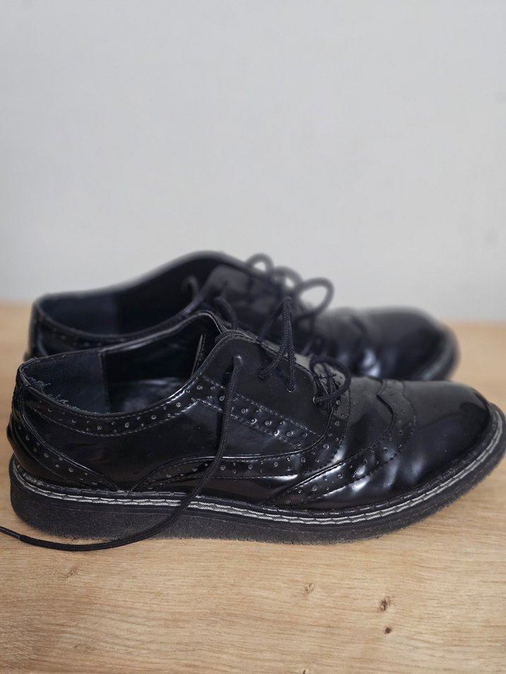 Siyah rugan kadın klasik ayakkabılar, brogue detaylı ve bağcıklı tasarıma sahip, günlük kullanım için rahat tabanlıdır.