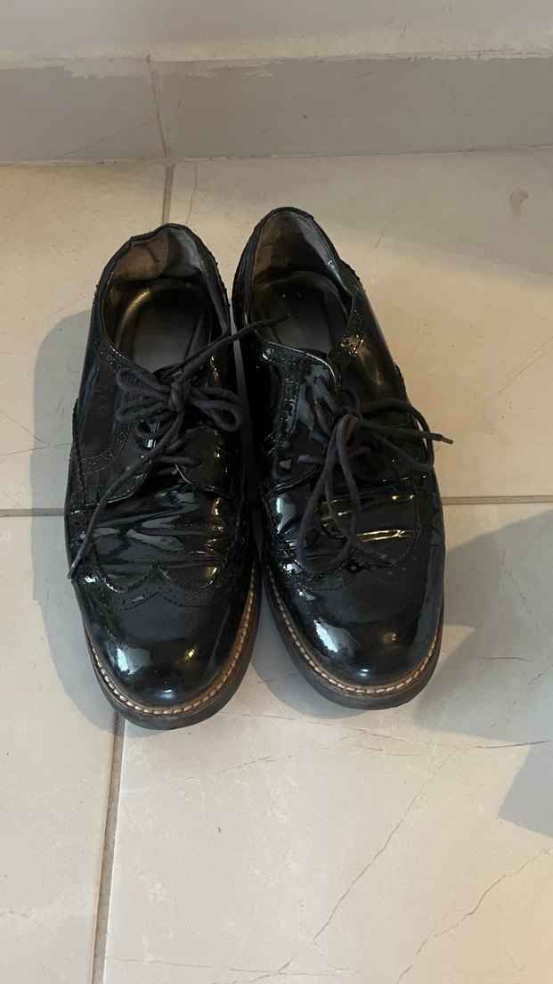 Siyah rugan görünümlü, stiletto , detaylara sahip goth tarzı kadın oxford ayakkabılar. Günlük kullanıma uygun.