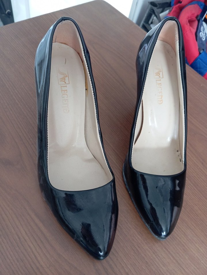 Siyah rugan görünümlü kauçuk stiletto topuklu ayakkabılar, cesur ve klasik gotik tarzıyla günlük kullanıma uygundur. Desensiz tasarımı şık bir görünüm sunar. 37 numara. Topuklardan biri hafif zedelenmistir.