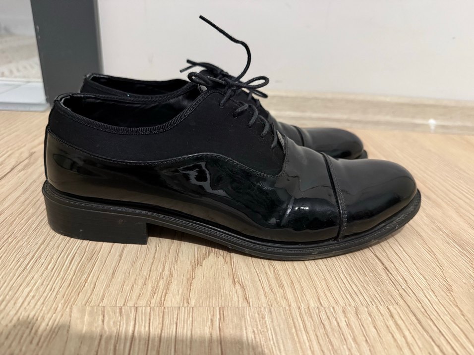Parlak rugan görünümlü, bağcıklı siyah klasik erkek ayakkabısı. Kauçuk tabanlı, ofis ve gotik tarz için uygun. Markası ds damat
