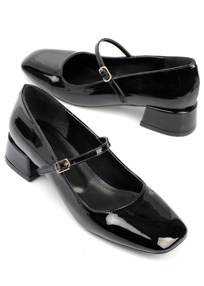 Siyah rugan küt burunlu topuklu ayakkabı