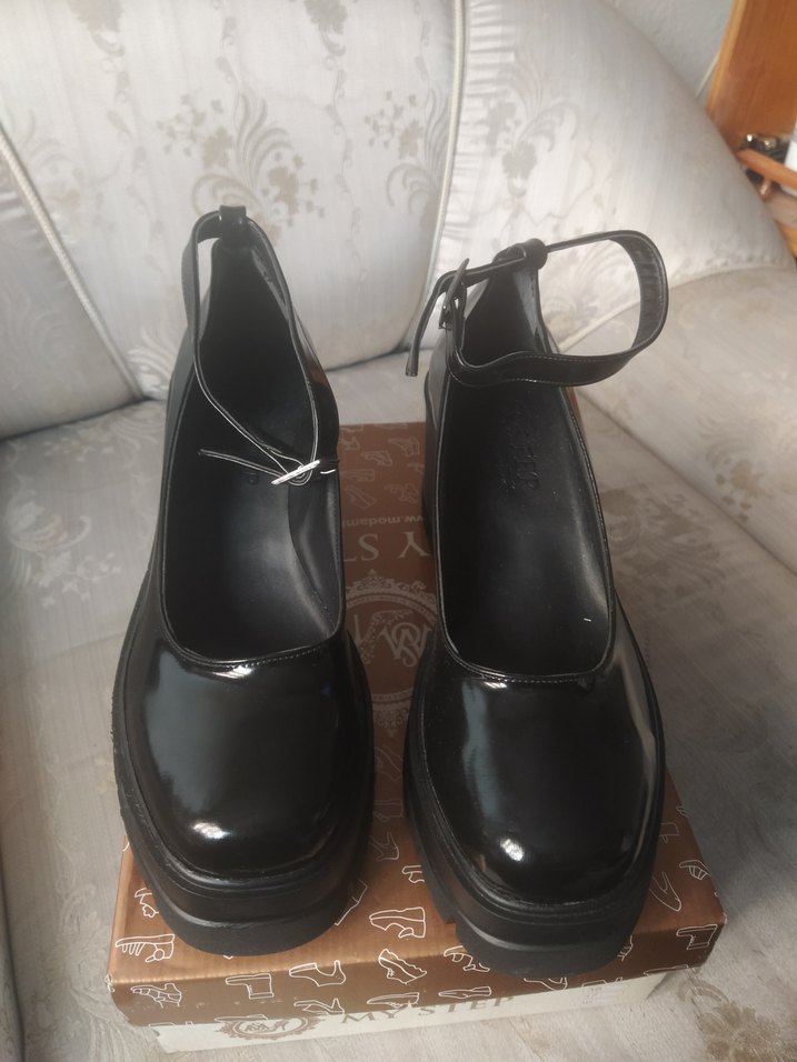Siyah rugan malzemeden, tokalı kayışlı ve platform topuklu goth tarzı ayakkabı. Desensiz ve şık görünüme sahip.