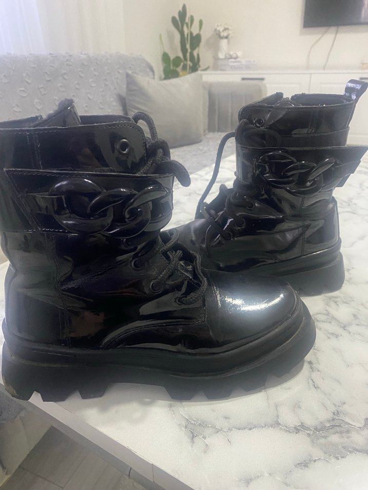 Siyah rugan görünümlü kauçuk botlar, platform topuklu, tokalı ve bağcıklı. Kamuflaj desenli, gotik tarzda, rock punk havası taşıyan günlük kullanıma uygun botlar. Kızım çok az giydi bir kusuru yoktur