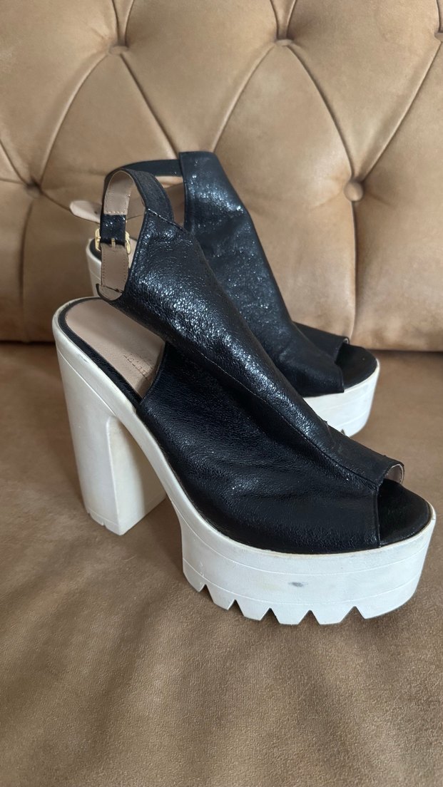 Ürünü bi ayakkabı mağazasından almıştım. Sadece 1 kez giydim artık topuklu ayakkabı giymediğim için satıyorum. 39 numara ama 38 giyen birine de rahatlıkla olur. Yüksek topuklu olmasına rağmen inanılmaz rahat. Topuk boyu 13,5 cm platform boyu 5cmdir. Vurma sıkma acıtma yapmıyor koşulabilecek kadar rahat bir ayakkabı. Sadece 1 kez giyildi ama alalı 5-6 sene olduğu için dolapta durmaktan biraz eskidi tabi o yüzden uyguna bırakıyorum maksat yer kaplamaması ve elden çıkartmak. Gözle görülür büyük bir kusur yok derisinde açılma dökülme vs de yok. Alana şimdiden hayırlı olsun. Ayakta duruşunu da sona ekledim. #platformtopuklu #ayakkabı #topukluayakkabı #siyah